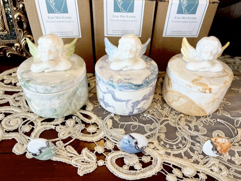 ? 일상생활에서 사용할 수 있는 팔찌와? 사랑스러운 천사 보석함. 도자기 자체로도 예쁘지만 반짝이는 러스터와 백금이 만나 더 예쁘게 변신했어요.